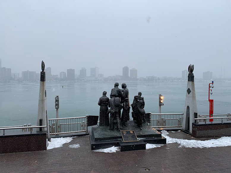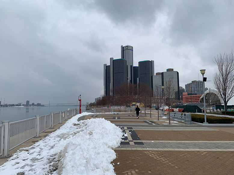 Po vynikající snídani pokračujeme do Detroitu. Ano, tento týden už po čtvrté. Pokaždé jsme tam byli jen pár minut a tak jsme chtěli město konečně trochu prozkoumat, projít si centrum a Jára možná ochutná místní specialitu zvanou Coney (hot dog). Nejdříve zběsile projíždíme centrum a hledáme místo na parkování, ale nakonec to vzdáváme a jedeme k promenádě u řeky, která je od centra trochu dál. Procházíme se podél řeky a koukáme do Kanady. Po promenádě běhají běžci, občas projede někdo na kole a my si představujeme, jak to tady bude vypadat v létě. Bude to tu určitě žít, stánky budou prodávat točenou zmrzlinu a ledové nápoje a na židličkách pod deštníky budou sedět američtí důchodci, rodiny s dětmi nebo mladé páry.