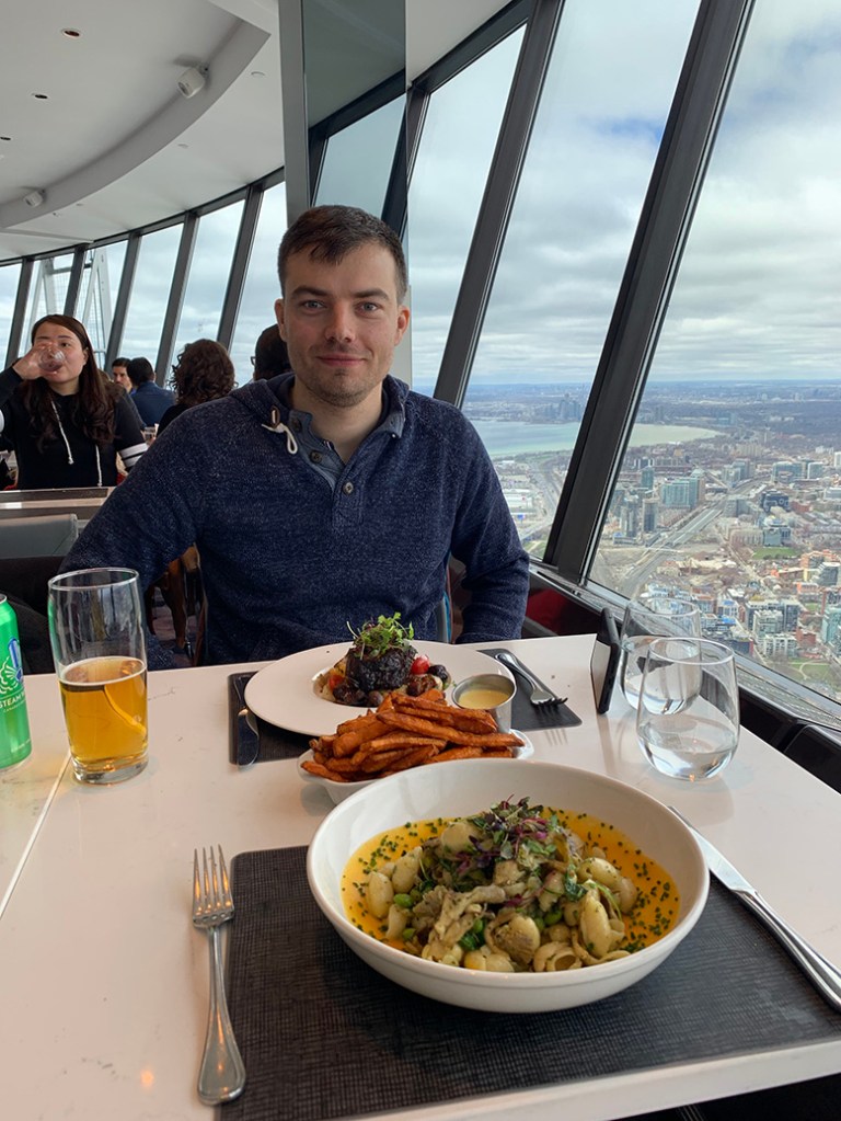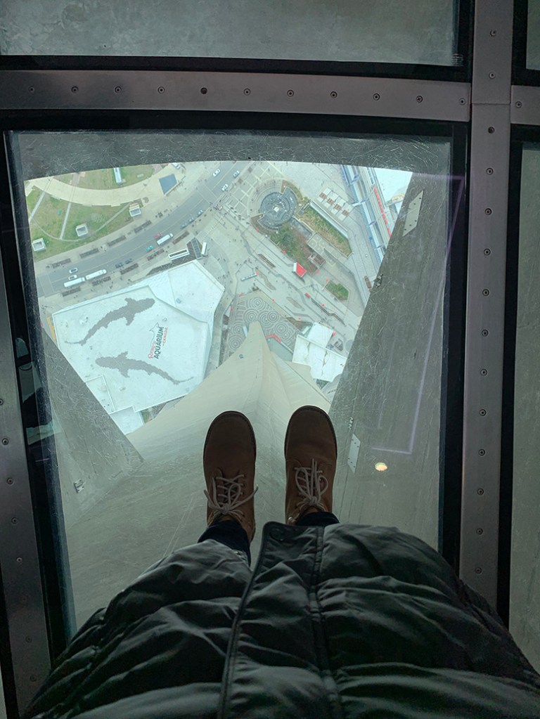 Cestou k vodě jsme se rozhodli, že s Járou zajdeme na CN Tower. Chtěli jsme tam původně na večeři, protože by bylo celé město pěkně nasvícené a oslavili bychom Járy svátek, ale večer už byla restaurace beznadějně plná. Tak jsme si řekli, že půjdeme na oběd. Došli jsme pod CN Tower, udělali rezervaci a paní nás poslala k výtahu. Přišli jsme si jako VIP hosté. Hned u vchodu jsme se oddělili od davu lidí, kteří chtěli jen na vyhlídku a šli přednostním vstupem. Výtah jel tentokrát pomaleji, než obvykle, protože strašně foukalo. Za dvě a půl minuty jsme byli ve 350 metrech nad zemí. Usadili nás u stolu a my koukali na ten úžasný výhled. Prvních deset minut jsme si museli zvykat na to, že se restaurace neustále pomalu otáčí. Já jsem „jela“ pozadu, což mi většinou nedělá moc dobře. Vybrali jsme si jídlo a pozorovali město. Za celou dobu jsme se krásně otočili o 360 stupňů a viděli tak celé Toronto. Kromě toho byla skvělá viditelnost a nakonec jsme usoudili, že to možná bylo ještě lepší, než v noci. Když jsme čekali na jídlo, zavolali nám kamarádi z Čech, na jejichž svatbě jsme bohužel nemohli být. A tak jsme jim alespoň stylově pogratulovali z oblak. Oběd byl vynikající a byl to naprosto úžasný zážitek. Po jídle jsme ještě zašli o patro níž, kde byla vyhlídka. Tam jsme si zase museli zvykat, že už se netočíme a oběma nám bylo trošku šoufl. Ještě o jedno patro níž byly úseky s prosklenou podlahou. Bylo zajímavé pozorovat lidi, kteří odhodlaně mířili ke sklu a pak se z ničeho nic zastavili a těžce oddychovali. Nebudu lhát, necítila jsem se zrovna dvakrát bezpečně, když jsem stála uprostřed skla v takové výšce a koukala dolů.
