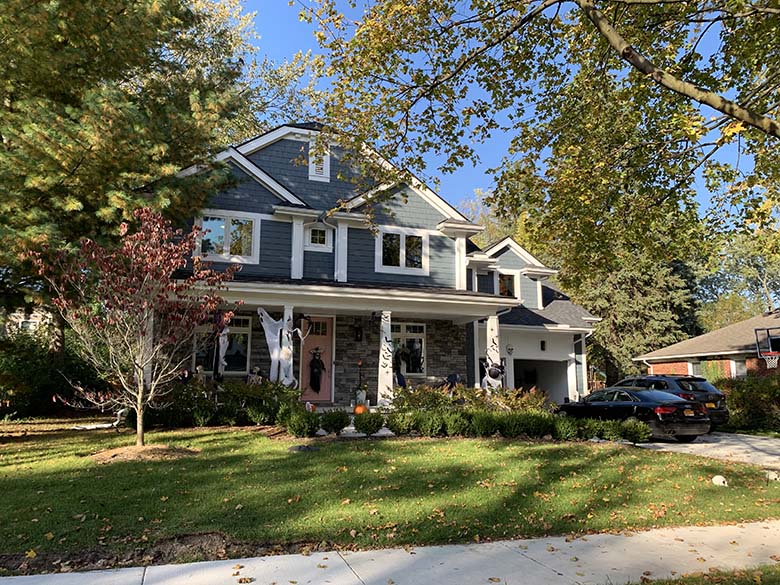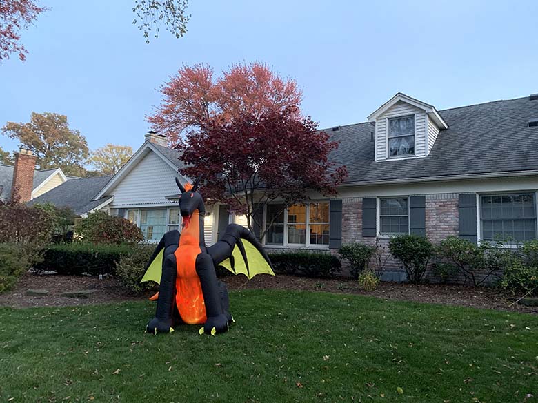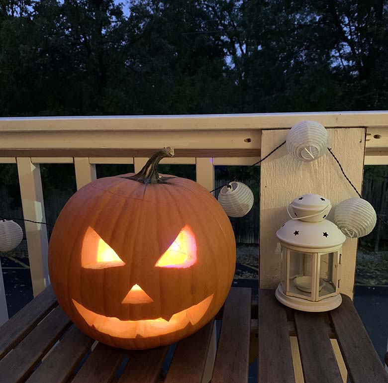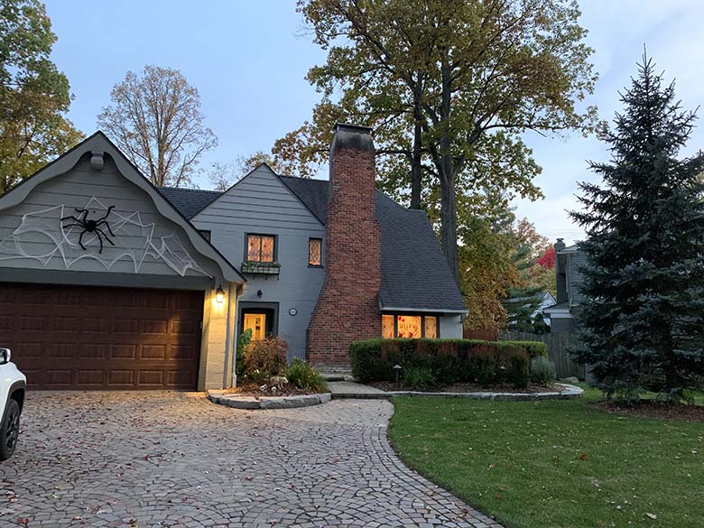 Každý víkend jsme chodili na procházky po okolí a s údivem pozorovali výzdobu. Nutno dodat, že decentní podzimní dekorace mělo jen minimum domů. Mnohem častěji jsme našli kosti zapíchané do země, kostlivce sedící na zápraží, dýně s všemožnými výrazy, pavučiny na stromech, náhrobky, kříže a duchy. Některé rodiny však výzdobu posunuly na další level. Viděli jsme rodinu kostlivců sedící na zahradě společně s kostrou jezevčíka, “rozpláclou” čarodějnici na stromě, obří nafukovací dýni na střeše, nafukovacího draka či gigantickou černou kočku před vchodem. Namísto pěkně vyřezané dýně jsme našli zvracející dýni a vrchol všeho byla okna popsaná krví.