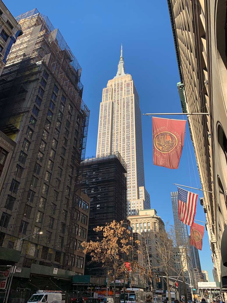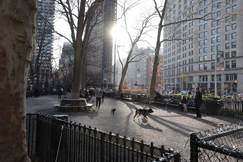 Z Times Square jsme pokračovali po Broadway a došli právě až před obchod Macy’s, před kterým tančil sekuriťák a nabádal kolemjdoucí k příspěvku na armádu spásy. Minuli jsme Empire State Building, která byla v plánu jiný den a došli až k žehličce neboli Flatiron Building. Tam přišlo bohužel další mírné zklamání, protože byla známá budova ve tvaru žehličky obklíčená lešením. A tak nepůsobila vůbec tak špičatě. Ale s tím se holt nedá nic dělat. Moc se nám ale líbil přilehlý Madison Square Park. Tam jsme si chvilku odpočinuli a rozjímali kolem sebe. Nebyl tam takový shon a ruch a dalo se tam dýchat. Přestože sluníčko svítilo na plné pecky, byla většina ulic tmavá a šedá. Vzhledem k tomu, že jsou ulice poměrně úzké a lemují je mrakodrapy, není divu, že se sluneční paprsky až dolů na chodníky prostě nedostanou.