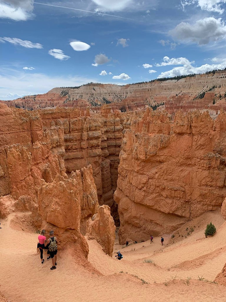 Tady však byla má reakce plně na místě. Před námi se rozprostíral obří kaňon plný stovek oranžovo-červených pískovcových věžiček. Byla to nádhera! Chvíli jsme jen tak stáli u okraje a otáčeli hlavou zleva doprava jak na tenisovém zápase. Pak jsme vytáhli mapku a naplánovali si krátkou procházku. Došli jsme k “Sunrise point” kde jsme se zase trošku pokochali. Potom jsme po stezce “Queens Garden” seběhli dolů a proplétali se mezi pískovcovými věžičkami. Dole jsme prošli lesíkem a vyšlápli si to zpátky nahoru po stezce “Navajo Trail” až k vyhlídce “Sunset”. Cestou nahoru jsme procházeli po úzkém chodníčku mezi dvěmi vysokými skalními stěnami, za kterými jsme pak serpentinami vylezli jak mravenečci až nahoru. Nakonec to bylo asi 4,5 kilometru, což je ideální na protažení nohou po cestě a krátké prozkoumaní terénu. A zbylo ještě docela dost času na projetí zbytku parku.