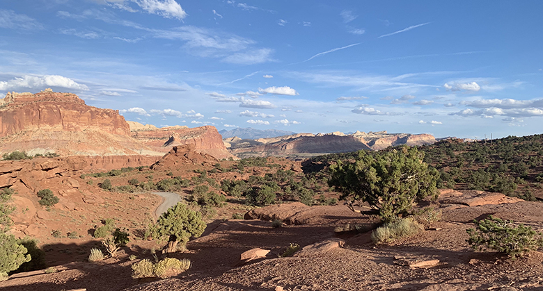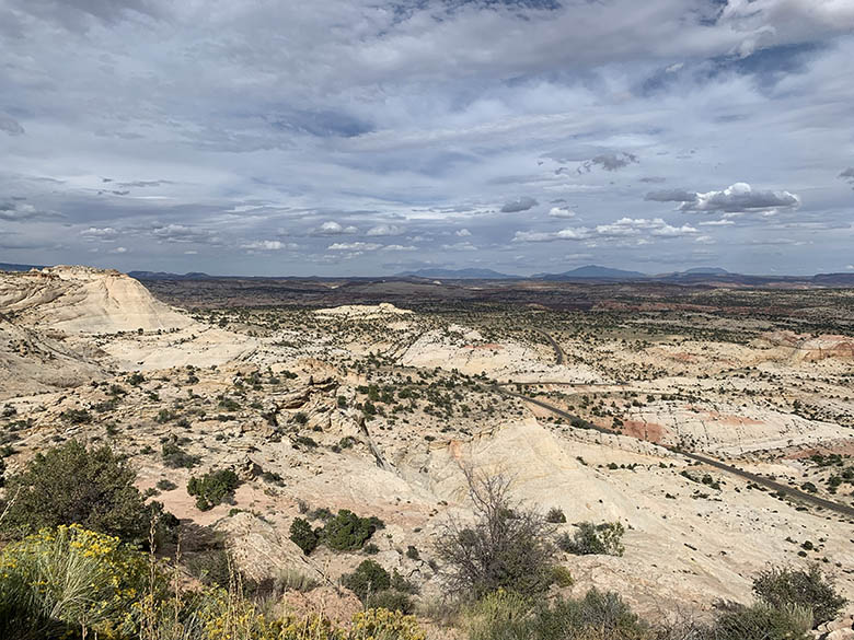 Zhruba v půlce mezi městečky Escalante a Boulder jsme zastavili na vyhlídce “Head of the rocks” a rozjímali desítky kilometrů daleko. Na všechny strany byly jen skály, kameny, keře a písek a skrz to se vinula jediná asfaltová cesta se žlutým pruhem uprostřed. Naskočili jsme zase do auta a pokračovali dál. Následovala krásná scénická cesta, která vedla po hřebeni a člověk tak měl výhled na všechny strany. Snažila jsem se to zaznamenat, ale prostě to nešlo. Jedno vím jistě, cesta číslo 12 z Bryce Canyon do Capitol Reef opravdu stojí za to.