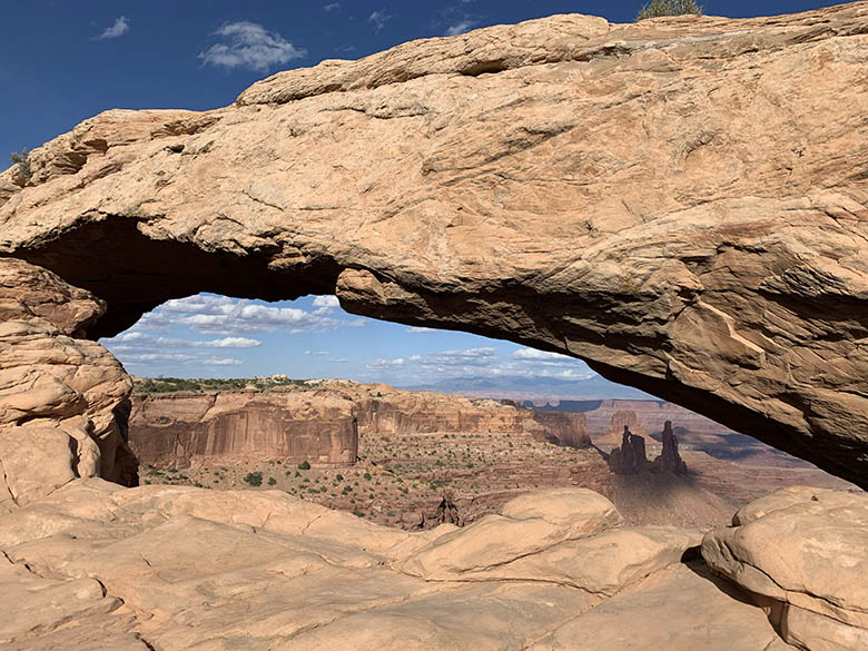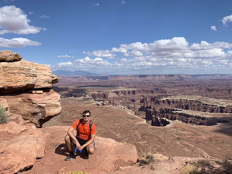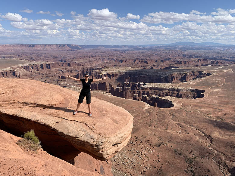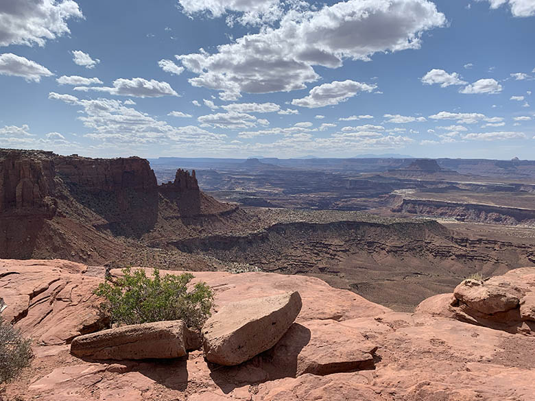 Jak už název parku napovídá, jedná se o seskupení několika kaňonů, které vytvořily řeky Colorado a Green River. Park je vcelku obří a je rozdělen do třech částí- Island in the Sky, The Needles a the Maze. Hranicí jsou právě ony zmíněné řeky. My jsme měli čas na prozkoumání jen jedné části a tak jsme si vybrali tu největší, Island in the Sky. Od vstupu do parku to bylo dalších 20 kilometrů k nejvzdálenější vyhlídce “Grand View Point”. Tam jsme protáhli nohy a během krátké procházky jsme se kochali výhledy na obří kaňony. Zase to bylo úplně něco jiného než co jsme viděli doteď. Přišlo nám jak kdybychom se ocitli na Marsu. Procházeli jsme se podél okraje kaňonů a rozhlíželi se na všechny strany. Na dně kaňonu vedou cestičky a je možné podniknout celkem velké túry. Někde jsme dokonce zahlédli i Jeepy, které svištěly po prašných cestách a nechávaly za sebou prašný mrak.