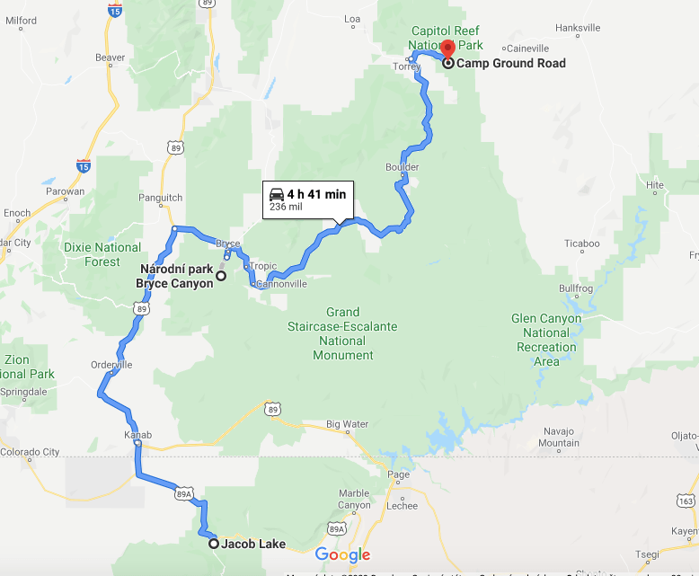 Dnes náš čeká zase pěkná štreka. Z kempu v Jacob Lake vyrážíme do národního parku Bryce Canyon a pak přejíždíme do dalšího parku Capitol Reef kde máme zamluvený nádherný kemp, alespoň podle Járy vyprávění. Tentokrát vůbec nevím co nás čeká. O národním parku Zion, ve kterém jsme byli den předtím, jsem si něco zjistila, protože jsem měla z té túry trošku strach. O dalších parcích jsem nevěděla zhola nic. Což bylo nakonec strašně dobře. Google mapy, street view a stovky fotek jsou skvělé a při plánování dovolených hodně pomůžou. Ale mám pocit, že kvůli tomu někdy zmizí takový ten wow efekt, ten moment překvapení.